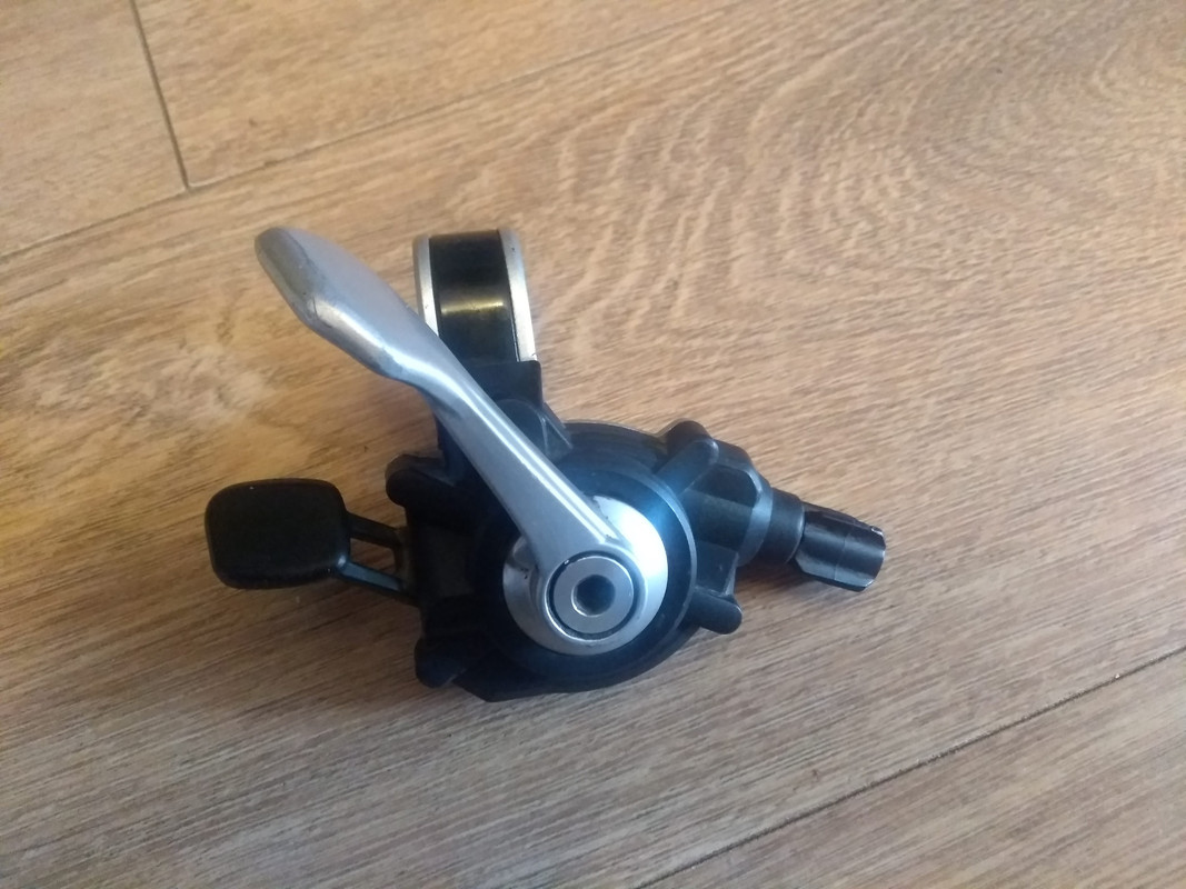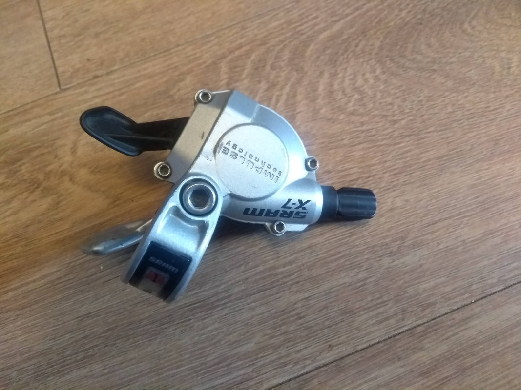 Левая (передняя) манетка SRAM X-7 на 3 скорости (старого образца, с индикатором в хомуте), состояние хорошее, без трещин и больших потёртостей, щёлкает исправно.