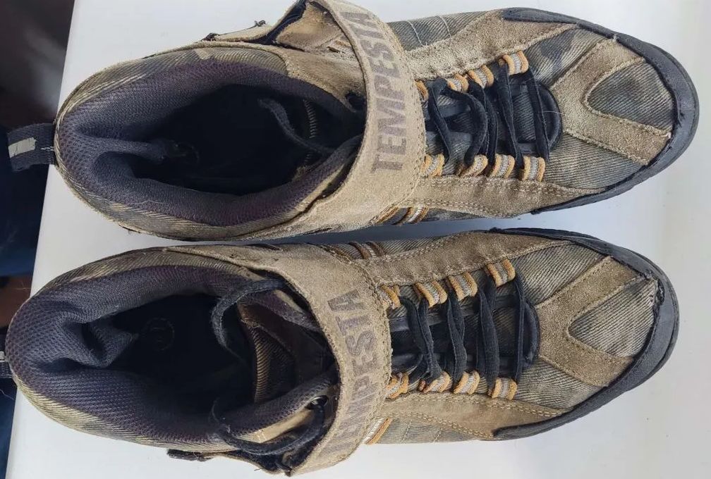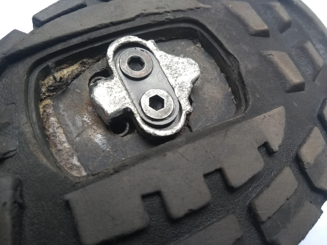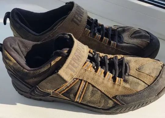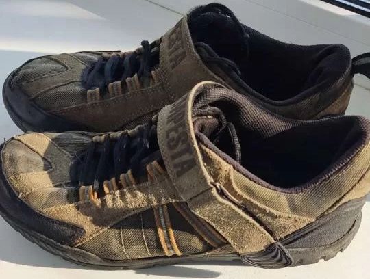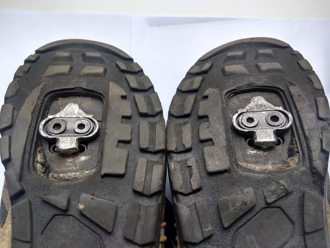 Велоботинки сравнительно "городского" вида, шнуровка плюс верхняя затяжка с липучкой. Сильно поюзанные, есть трещина на подошве под шипом, подпятники стёрты и на одном из носков почти сквозная протёртость (на фото всё видно). Стоят китайские шипы под Шимано (аналог sh51), изрядно стёртые за этот сезон, но в принципе ещё можно покатать немного.