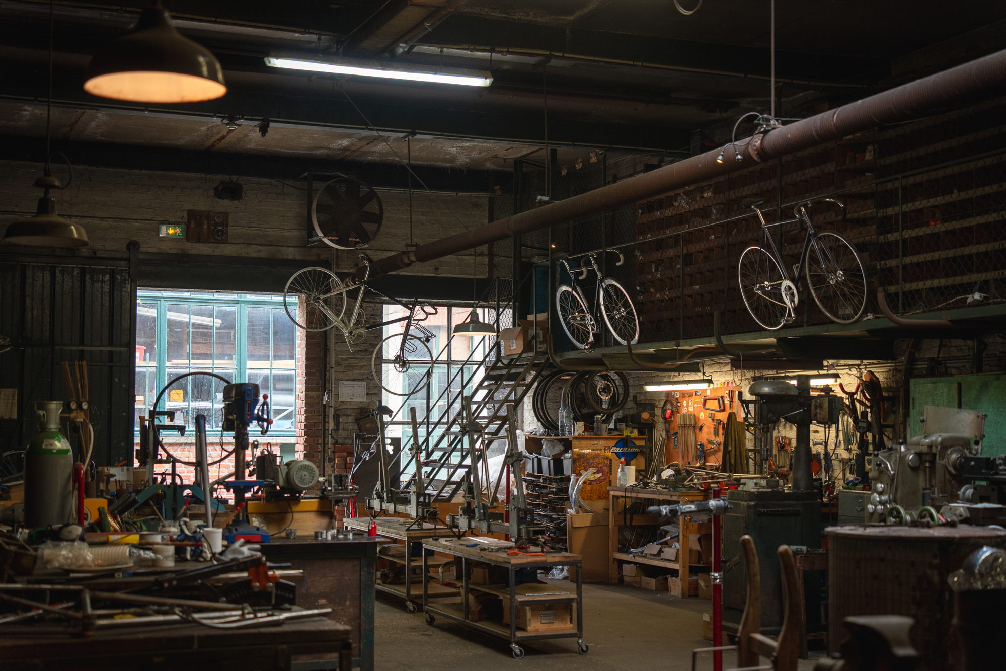 В воздухе витает запах машинного масла, ржавчины и мокрого дерева. Незаконченные велосипедные рамы висят на за старых трубах отопления над холодным бетонным полом. Здесь сыро, темно и индустриально. В глубине помещения гордо возвышается старая пузатая печь, напоминающая о прошлых зимах, когда замерзающие машинисты сталкивались с холодным металлом. Но когда весеннее солнце пробивается сквозь облака и льется сквозь заводские окна во всю стену, старая кузница наполняется жизнью.